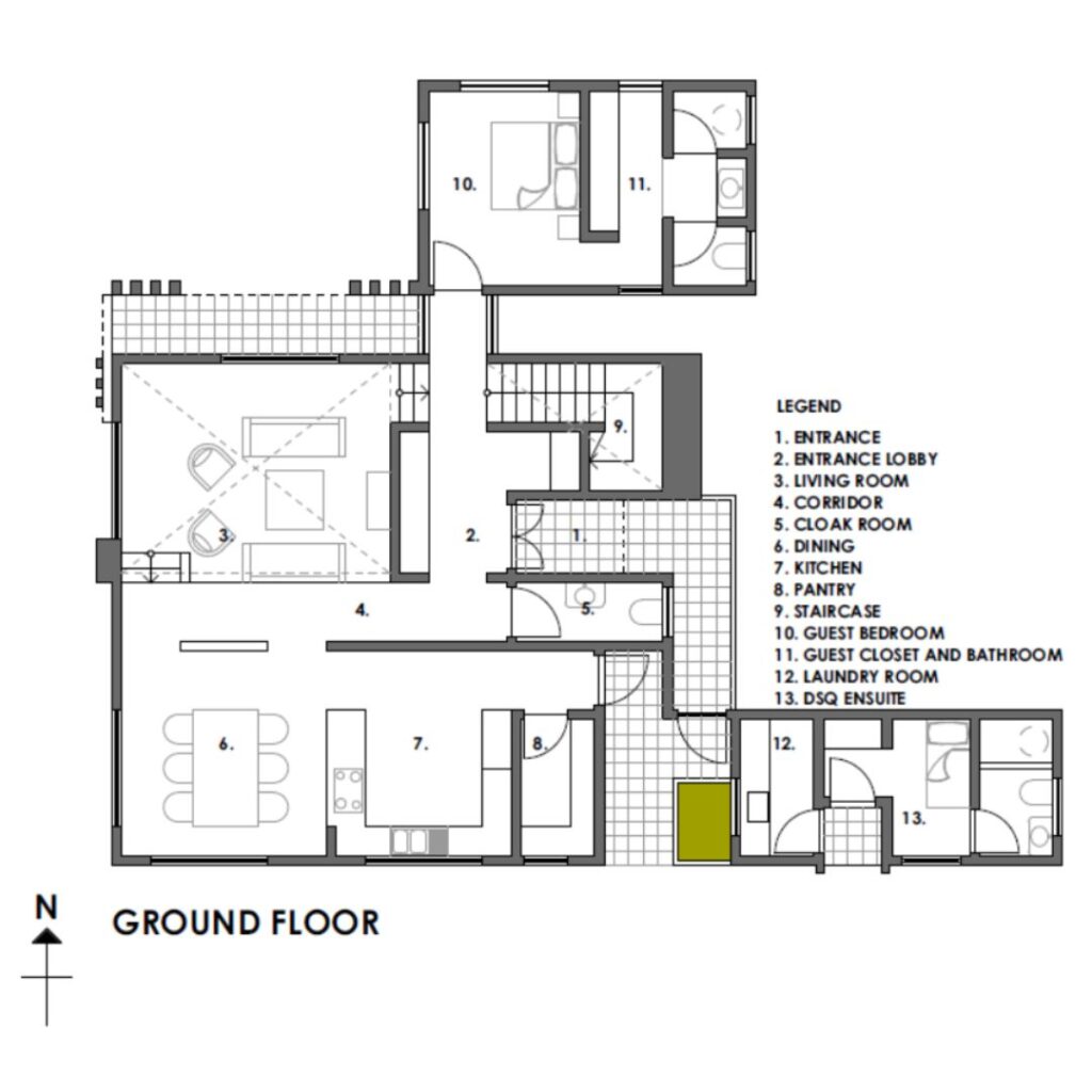 M.N house, Ndeiya: This is a three-bedroom house whose special features are detached bedrooms from the main house linked by a corridor with full height glass windows on ground and first floor. The dsq unit is also not attached to the main house but has a special design of path that is linked to the main house via a store. The living room is also sunk by three steps. The master bedroom has its own lounge and walk-in closet.